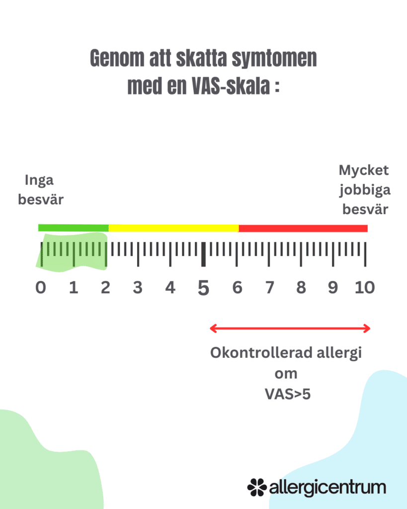 VAS står för Visuell Analog Skala, och används inom vården för att mäta allt från smärta till allergibesvär. Skalan går från 0 till 10.Exempelvis kan du få frågan:”Hur besvärande är dina allergisymtom just nu?”.Du svarar genom att sätta ett kryss på skalan.